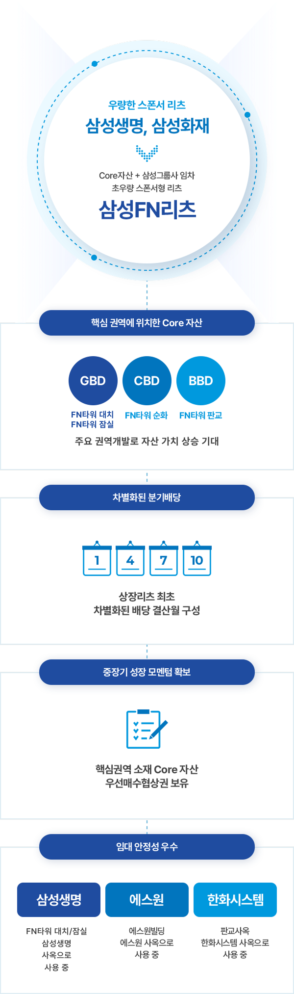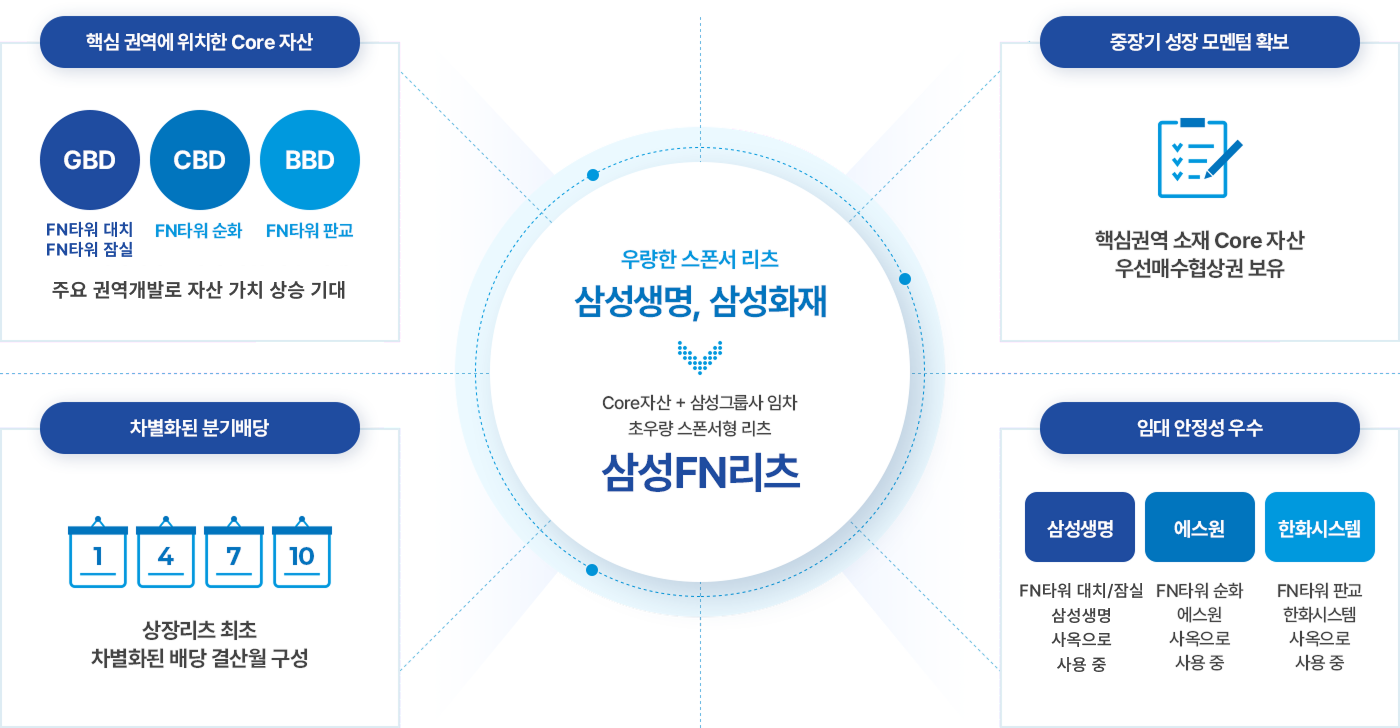 삼성FN리츠는 우량한 스폰서 기반으로 안정성과 상품성, 성장성을 두루 갖춘 투자 상품입니다.